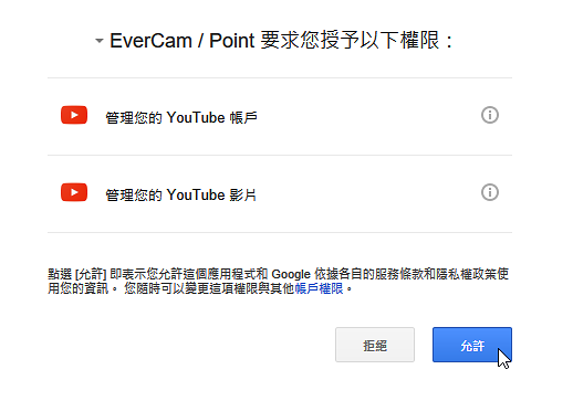 登入後,請允許 EverCam 可以存取 YouTube 的相關權限。